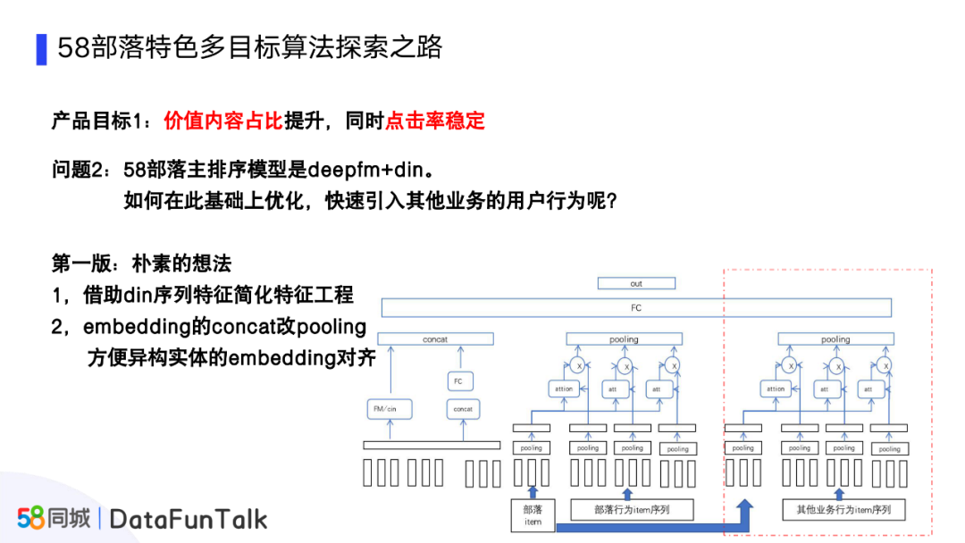 首先介绍下58部落的主排序模型:是DeepFM+Din的融合模型,那如何在此基础上进行优化,快速引入其它业务的用户行为呢?