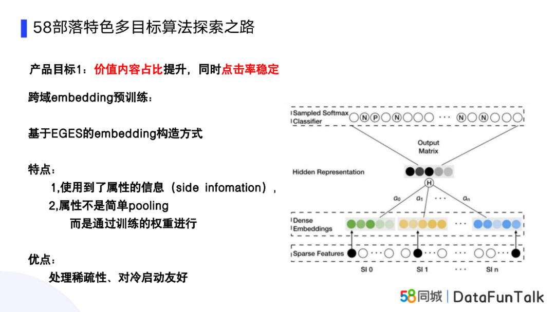 为了训练学习到跨域的知识,我们调研了很多方式,从阿里的EGES模型获得了一些启发。EGES模型比较适合跨多域的预训练方式,模型的底层是非常常见的的embedding的表结构,通过加上权重的Pooling,最后得到Embedding的表达,使用到了属性值,对于冷启动和稀疏性的处理也非常的友好。