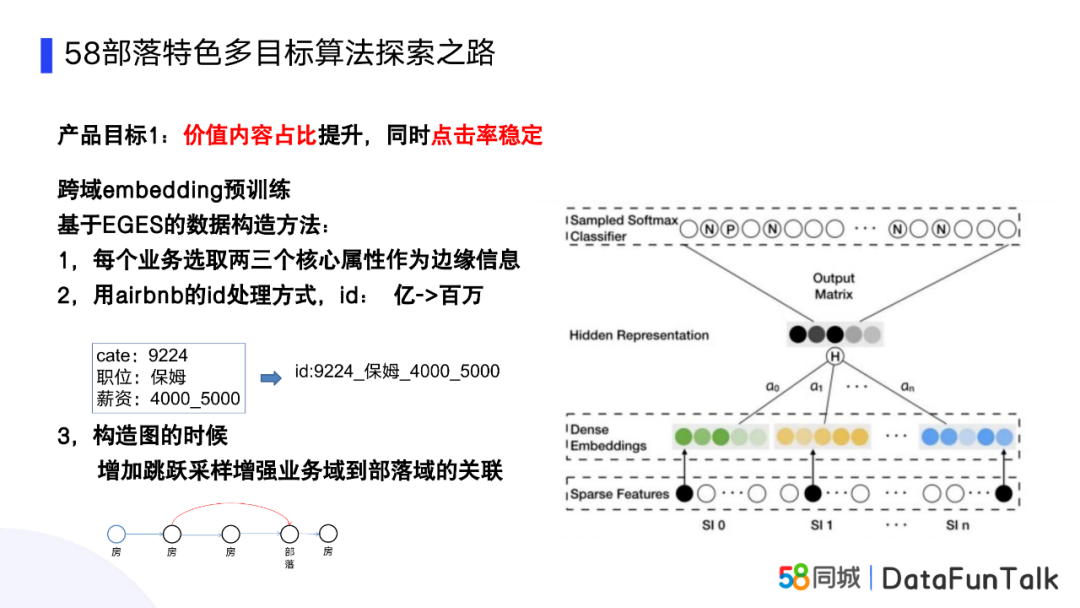 第三,因为目标是比较明确的,就是为了训练出业务域到部落的关联行为。所以在构造图的时候,就会增加一些跳跃的采样方式,即业务到部落的前一个点也可以新加一次关联,这样在统计用户行为边权重的时候,也就会增加很多业务到部落的权重。