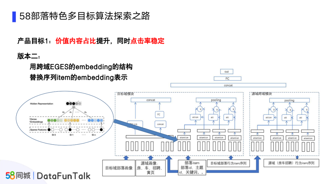 模型的版本二,就是用跨域的EGES训练生成的Embedding表示,替换版本一中序列Item Pooling的Embedding表示。通过这种预训练的方式,可以提前学习到业务线和部落的一些关联关系。最终,部落的点击率和价值内容占比都获得了一定的提升。