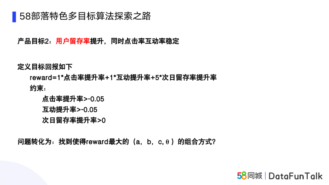 定义了策略方案,我们需要定义一个评估或者说目标回报,因为目标是提升用户的留存率,所以把次日留存率权重设置为5,点击率提升率,互动率提升率也放到回报里面;同时也把点击率提升率、互动率提升率、次日留存率提升率作为约束放在里面,对于负向的提升也是有一定容忍的,因为目标是提升用户的留存率,所以次日留存率提升率是要大于0的。这样问题的转化就变成了找到使得reward最大的(a,b,c,θ)的组合方式。