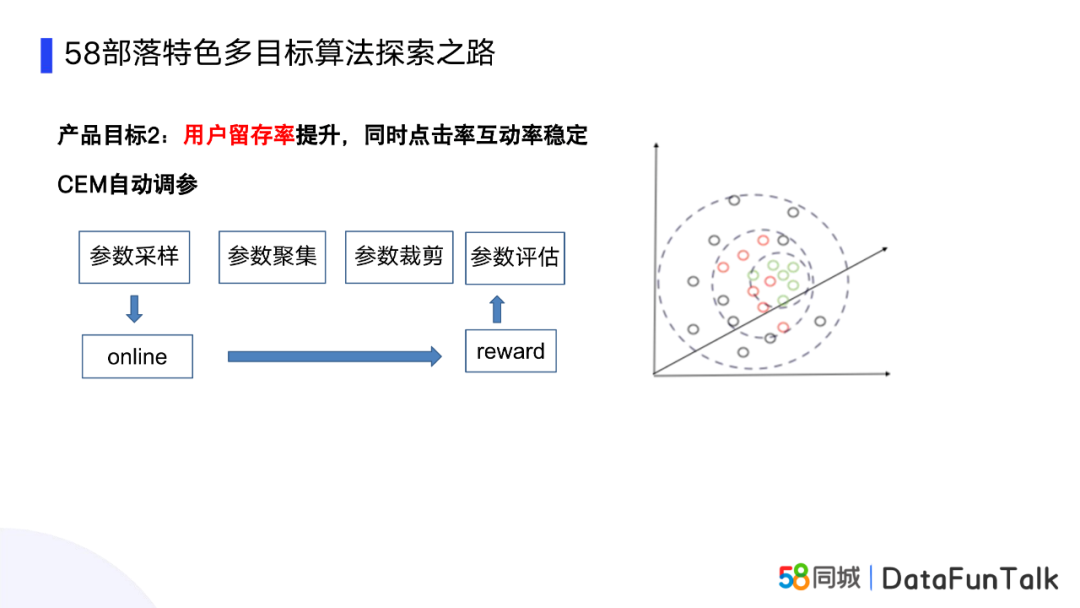 设想如果是单参数的,可以使用abtest的方式,把参数都试一遍,找最优的参数;但如果是多参数,使用abtest的方式,实验数量要指数增长,会浪费大量流量,针对于这个问题,我们找到一种调参方式,使用CEM自动调参,优点就是可以直接优化线上目标,实现长期的迭代。