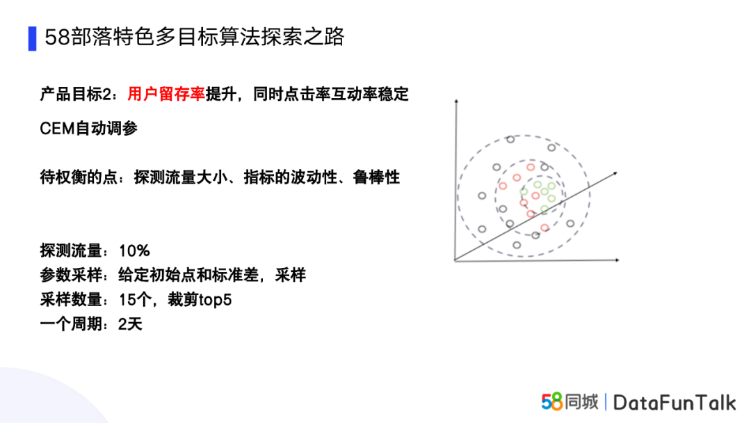 使用线上大概10%的流量进行探测,参数采样是给定初始点和标准差,采样数量为15个,裁剪top5,每两天进行一次,因为优化目标是留存,所以在第二天的时候,可以知道用户留存的一些指标。