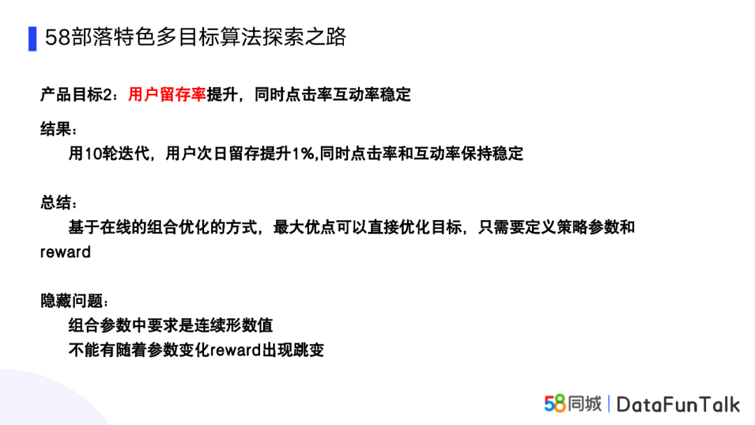 这两个目标的特点在于,价值内容占比是一个事后数据统计的数据,很难明确找到目标对应的label;而用户的留存率更是一个长期的目标,很难通过一次点击或者互动去界定。