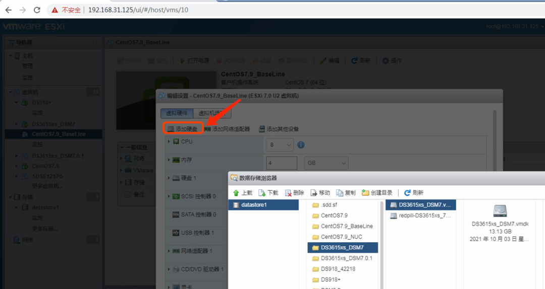 1、先将原黑群晖的数据盘vmdk文件挂到CentOS7.9的虚拟机中