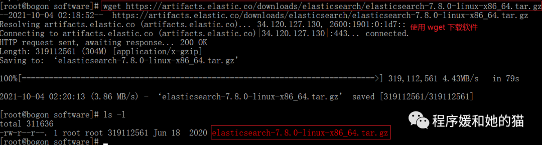 wget https://artifacts.elastic.co/downloads/elasticsearch/elasticsearch-7.8.0-linux-x86_64.tar.gz,将软件下载到 opt/module/software 目录下。