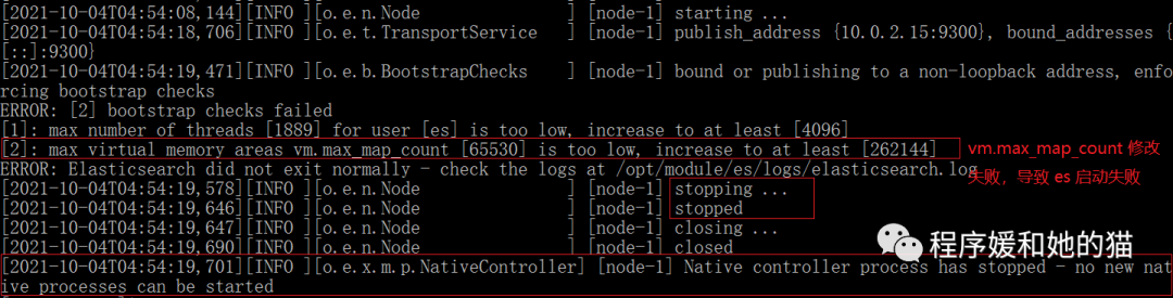 如果没有执行重新加载这一步,那么 vm.max_map_count 修改失败,还是默认值 65536,进而会导致后续的 ES 启动失败,启动报错信息见图15。(踩坑)