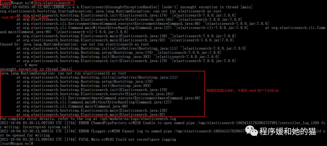 启动报错,见图16,原因是 ES 不能在 root 用户下启动,所以我们在启动前,先切换到 es 用户下。(踩坑)