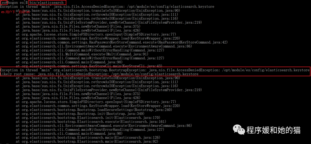 此时启动还是会报错,见图17,原因是使用 es 用户操作 opt/module/es 这个目录权限不够。(踩坑)