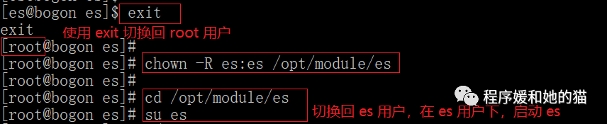 # 使用 exit 命令退出当前的 es 用户,回到 root 用户,或者用 su root 命令也可以切换回 root 用户。
