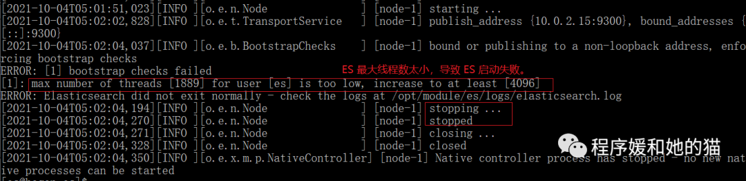 此时启动还是报错,见图19,原因是 ElasticSearch 最大线程数目太低。(踩坑)