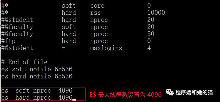 解决方案如下,修改 /etc/security/limits.conf,将 ES 最大线程数设置多一点,见图20。