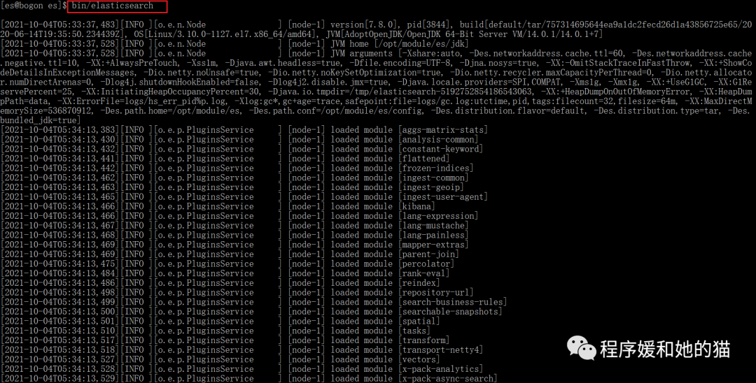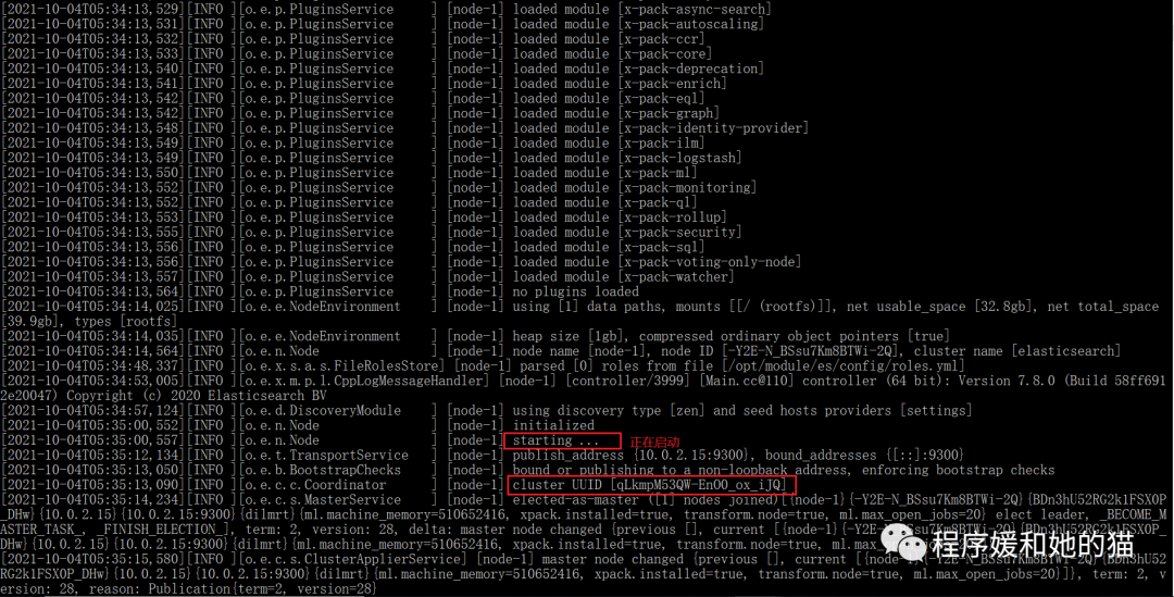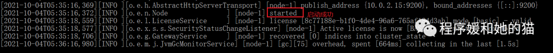 启动日志见图21、22、23,图23中出现 started,说明 ES 启动成功。