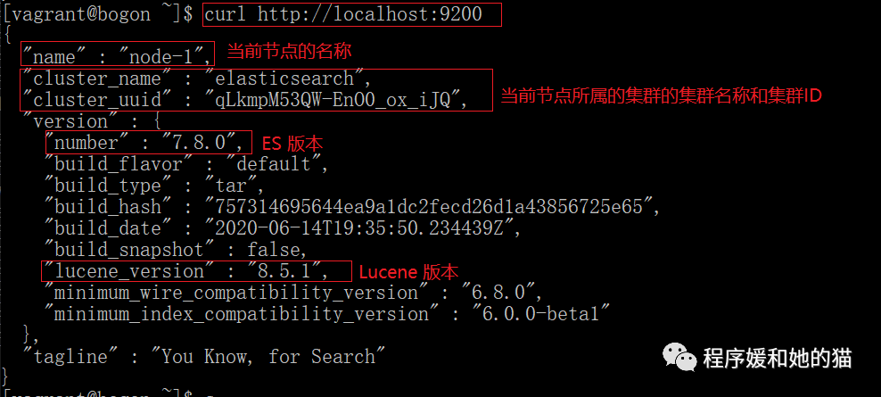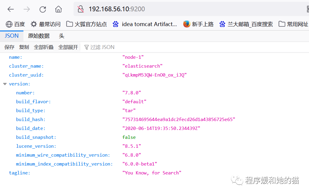 也可以这样验证 ES 是否启动成功?打开另一个客户端,访问 curl http://localhost:9200,如果能够得到当前 ES 节点的信息,就说明 ES 启动成功了,见图24。或者,使用你本地的 windows 环境的浏览器,访问 http://192.168.56.10:9200,如果能够得到当前 ES 节点的信息,就说明 ES 启动成功了,见图25。