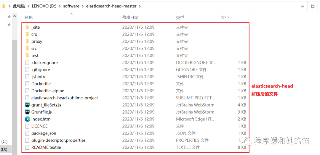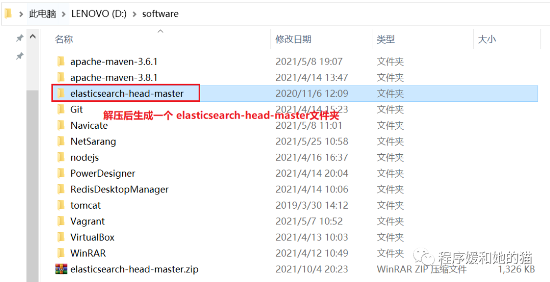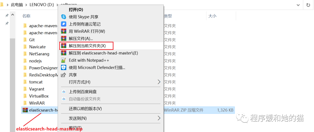 将下载下来的 elasticsearch-head-master.zip 解压缩,右键“解压到当前文件夹”,见图32,此时会自动生成一个 elasticsearch-head-master 文件夹,里面就是解压后的文件,见图33、34。