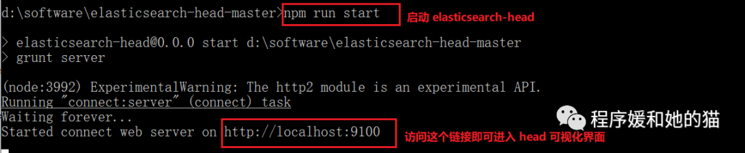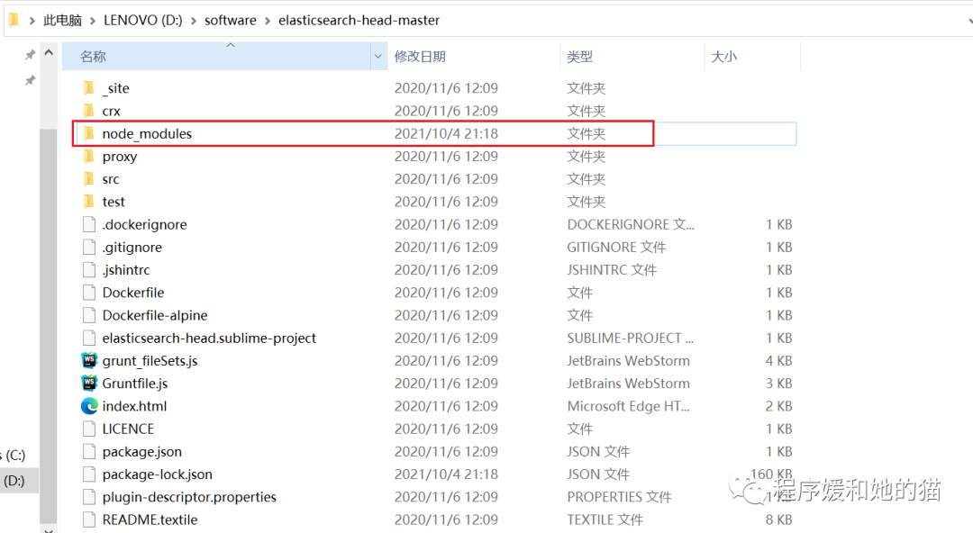 执行完 npm install,此时 elasticsearch-head-master 文件夹下出现一个 node_modules 文件夹,说明 npm install 执行成功。