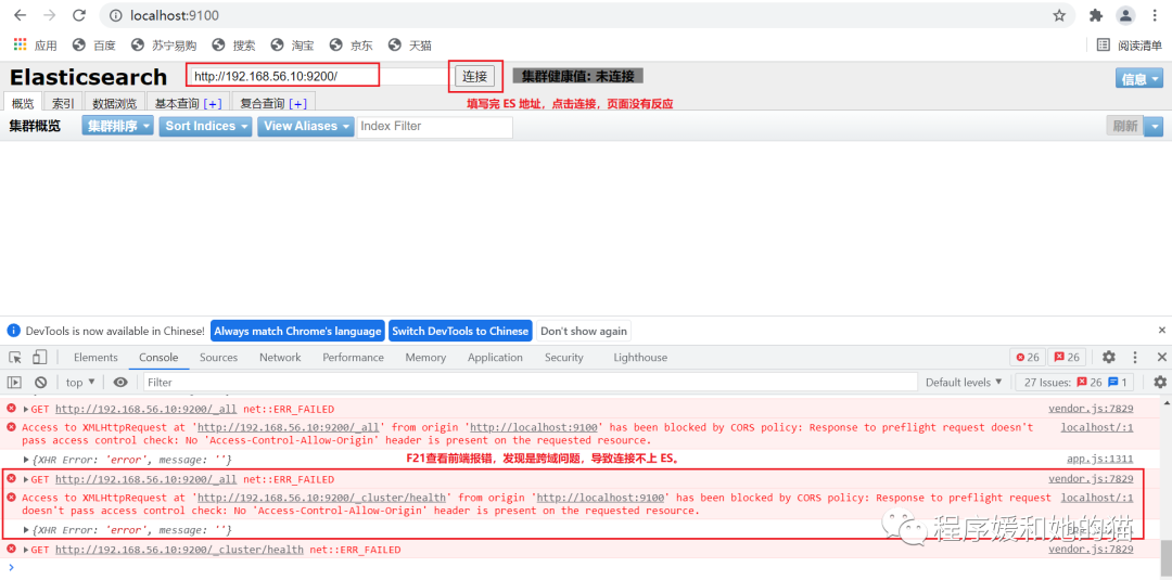 我们在 head 插件中填写了刚刚安装的 ES 的地址,点击连接,发现页面没有反应,F12,查看前端报错,发现是典型的跨域问题导致 ES 连接不上。
