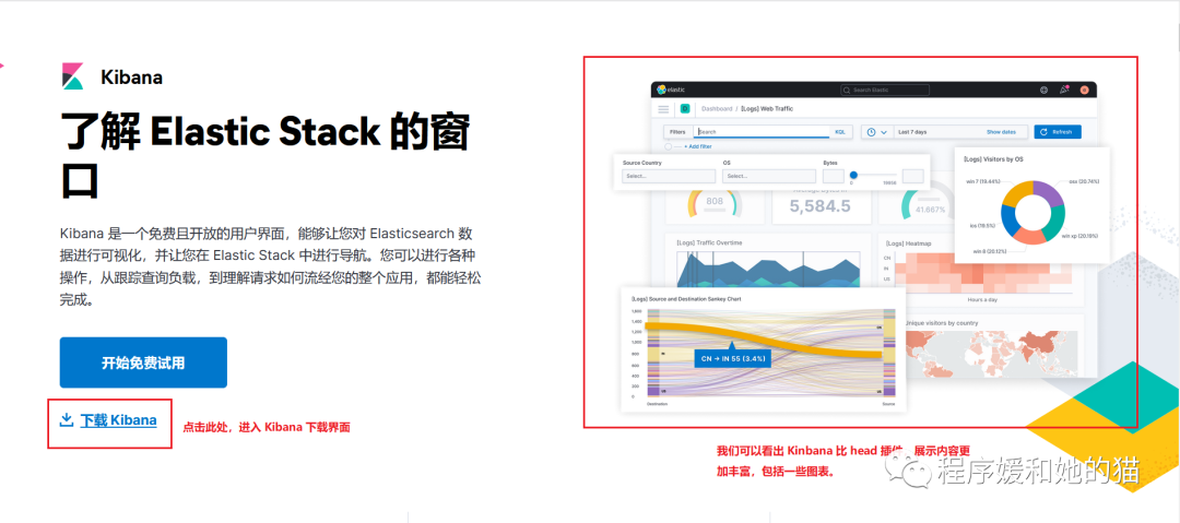 Kibana 官网:https://www.elastic.co/cn/kibana,见图44,右侧就是 Kibana 的样子,我们发现它比 head 插件展示的内容更丰富一些。