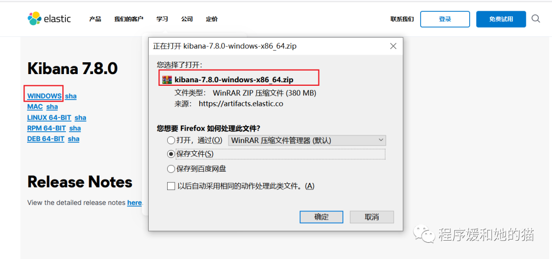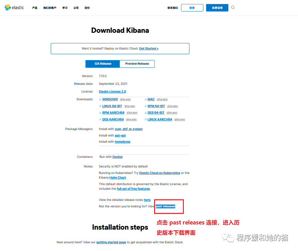 点击左下角的“下载 Kibana”进入下载页面,注意,Kibana版本和Elasticsearch版本同步更新,所以我们最好使用一致的版本,而我们 Elasticsearch 使用的版本是7.8.0,所以我们 Kibana 也需要下载7.8.0。在下载页面点击 past releases 连接,进入历史版本下载界面,选择 7.8.0 版本,我们下载 windows 环境的压缩包,包的全名为:kibana-7.8.0-windows-x86_64.zip。