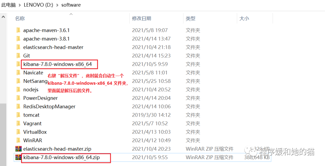 将 kibana-7.8.0-windows-x86_64.zip 复制到 D:\software,右键“解压到当前文件夹”,此时就会自动生一个 kibana-7.8.0-windows-x86_64 文件夹,里面就是解压后的文件。