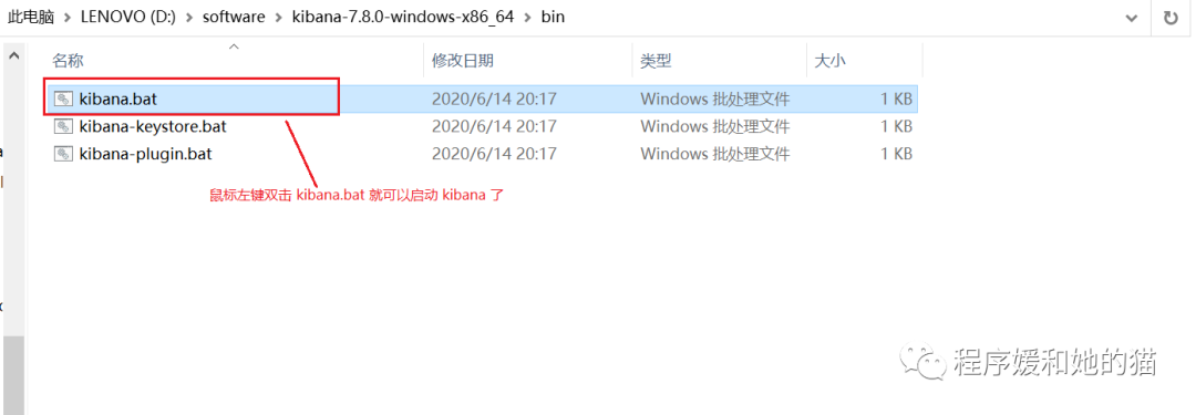 下载解压之后,以后我们每次想要使用 Kibana,只需要进入解压后的文件夹,进入 bin 目录,鼠标左键双击 kibana.bat 就可以启动 kibana 了。