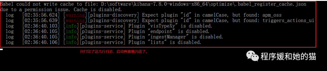 启动出现问题,kibana 启动的窗口只打印了几行日志,就闪退了,见图50。(踩坑)