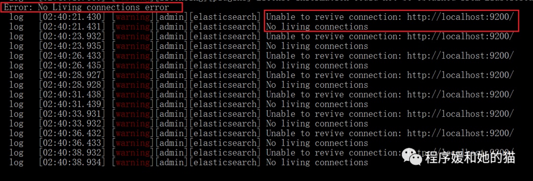 此时启动,还是有问题,报错信息见图52,这个报错原因显而易见,我们是在 windows 环境安装的 Kibana ,它启动之后默认连接本地 windows 环境的 ES,即图中的 http://localhost:9200,但是我本地并没有安装ES,因为我想用 Kibana 操作之前在 linux 环境安装的 ES,所以报错了。(踩坑)