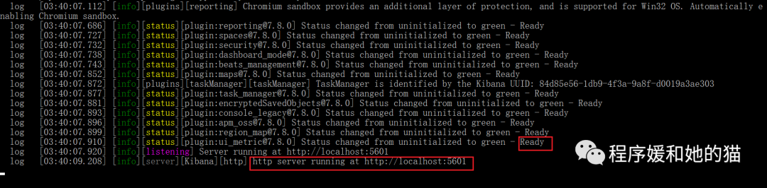 此时启动 Kibana,去启动日志见图53,出现 Ready 字样,以及最后一行 http server running at http://localhost:5601,说明 Kibana 启动成功。