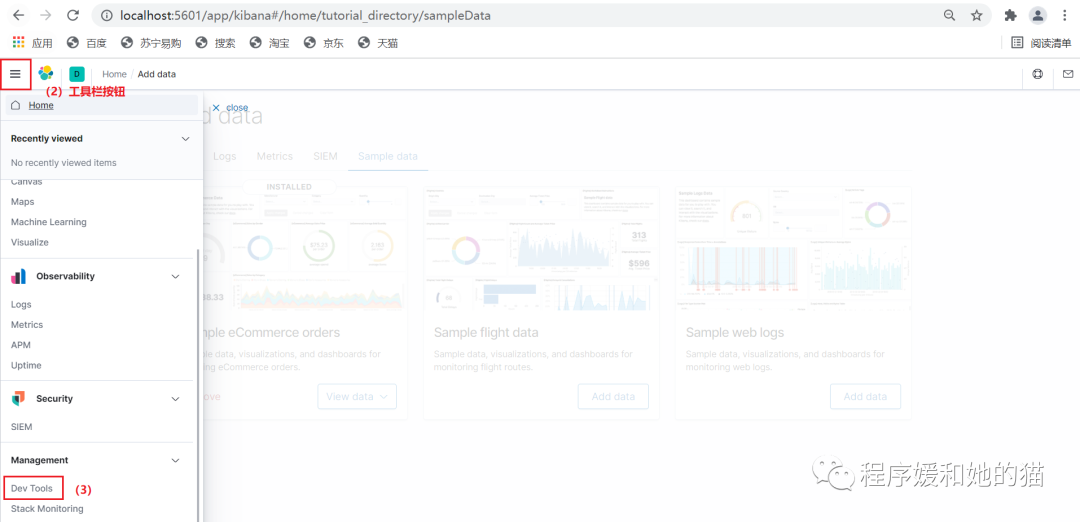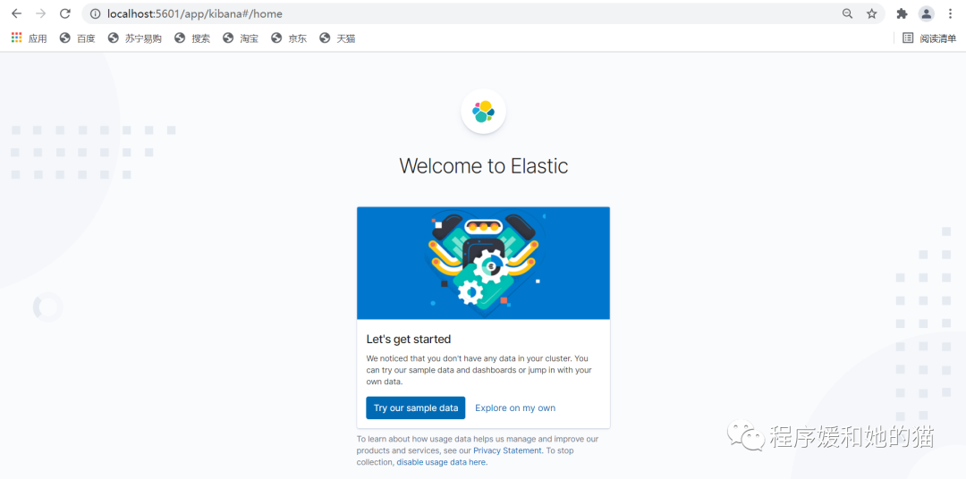 首先访问 http://localhost:5601,进入 Kibana 页面,点击“Try our sample data”进入新的页面。