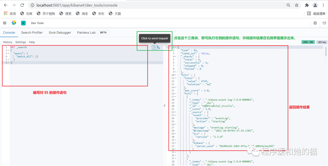 进入 Dev Tools,见图57,此时就可以在这个界面中对 ES 进行增删改查操作啦,左侧页面是编写操作语句,右侧界面展示操作结果。