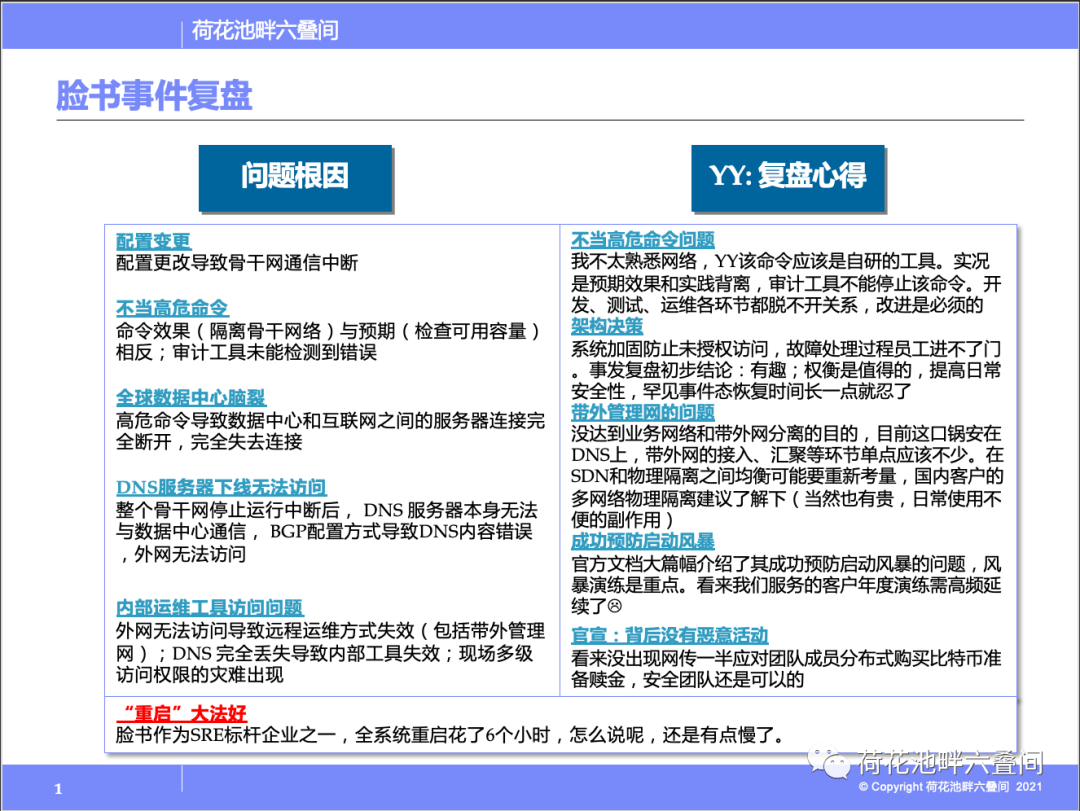 对IT运维从业人员来说,事故复盘是学习提高的快捷通道。当然,不能是发生自己运维对象系统上的事故,那就不是复盘而是被业务部门复仇了。2021国庆Facebook的6小时宕机事件,对正在进行从传统运维到SRE转型过程中的同学来说,是一个非常好的样本。