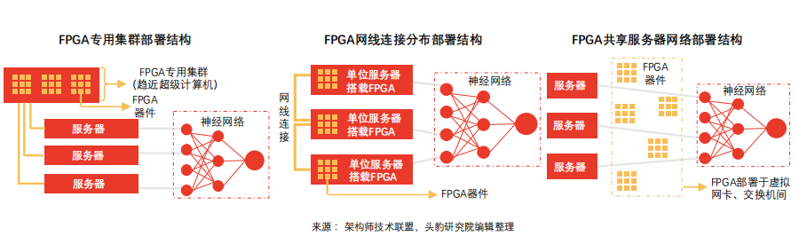 FPGA部署包括集群式、分布式等,逐渐从中心化过渡至分布式,不同部署方式下,服务器沟通效率、故障传导效应表现各异。