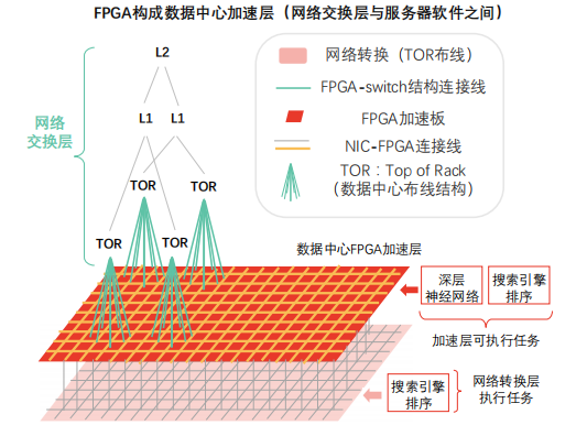 数据中心加速层:FPGA嵌入数据中心加速平面,位于网络交换层(支架层、第一层、第二层)及传统服务器软件(CPU层面运行软件)之间。