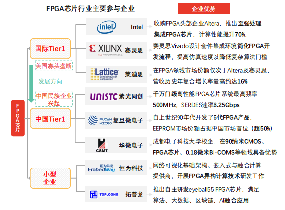 中国FPGA企业竞争突破口现阶段中国FPGA厂商芯片设计软件、应用软件不统一,易在客户端造成资源浪费,头部厂商可带头集中产业链资源,提高行业整体竞争力。
