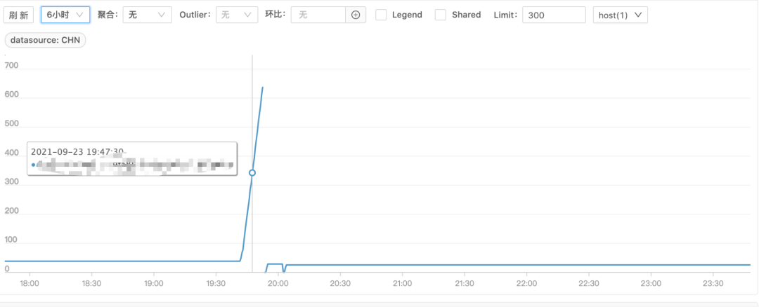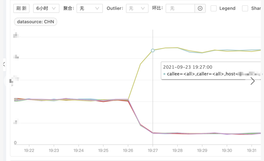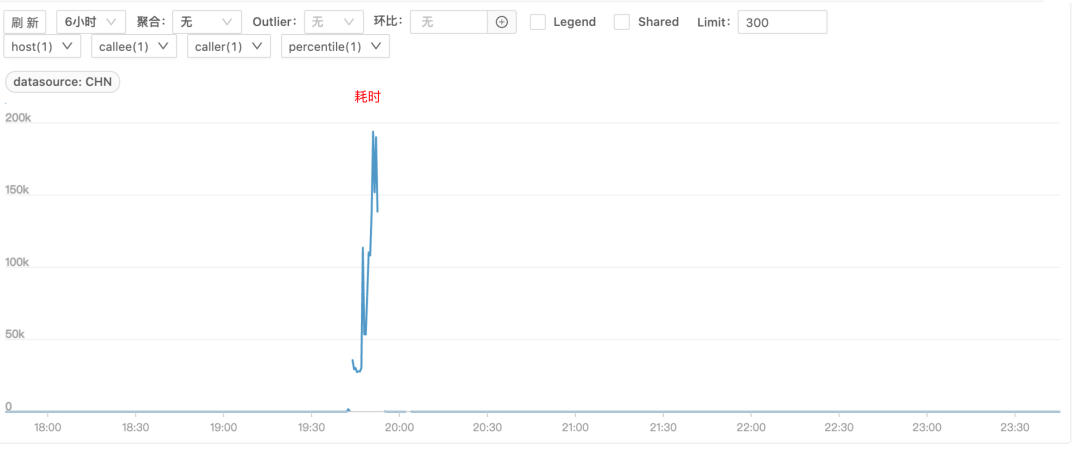 发生故障时 B 服务有几台机器完全夯死,处理不了请求,剩余正常机器请求量激增,耗时增加,如下图(图一请求量、图二耗时)