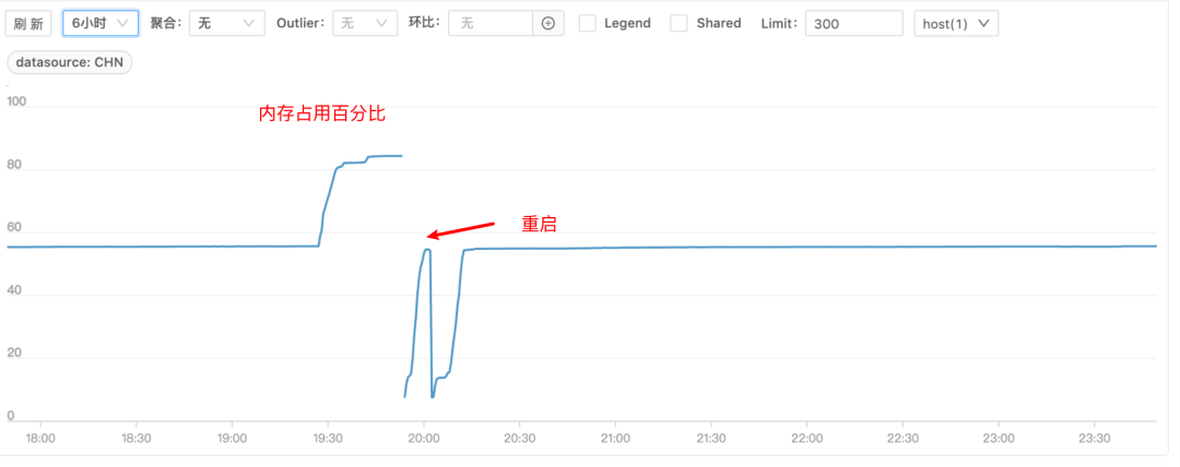 除了上述监控外,翻看了 B 服务 CPU 和内存等基础监控,发现故障的几台机器内存上涨比较多,都达到了 80% 的水平线,且 CPU 消耗也变多