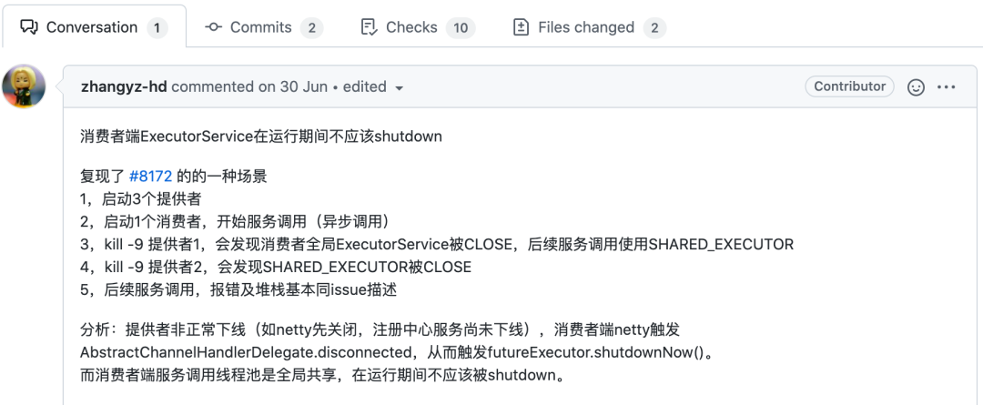 经过测试果然复现了,如 issue 所说,当 kill -9 掉第一个 provider 时,消费者全局 ExecutorService 被关闭,当 kill -9 第二个 provider 时,SHARED_EXECUTOR 也被关闭。