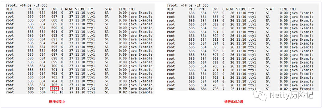 分别在Thread-A线程运行中和运行完成之后,通过ps -Lf 命令查看下线程.