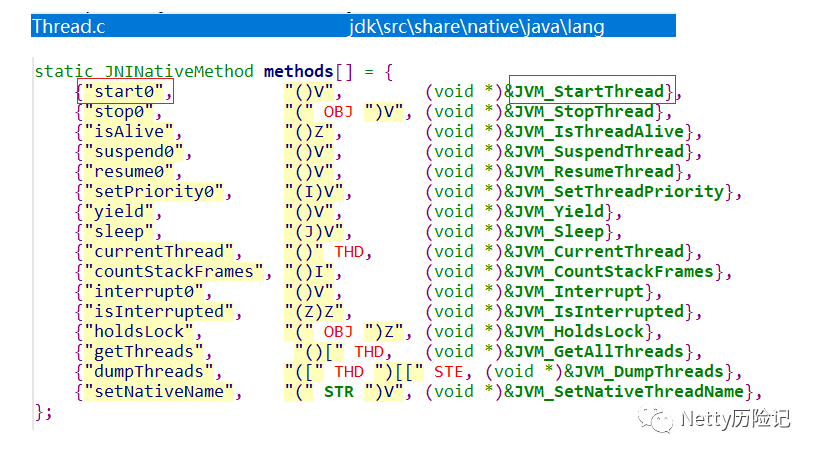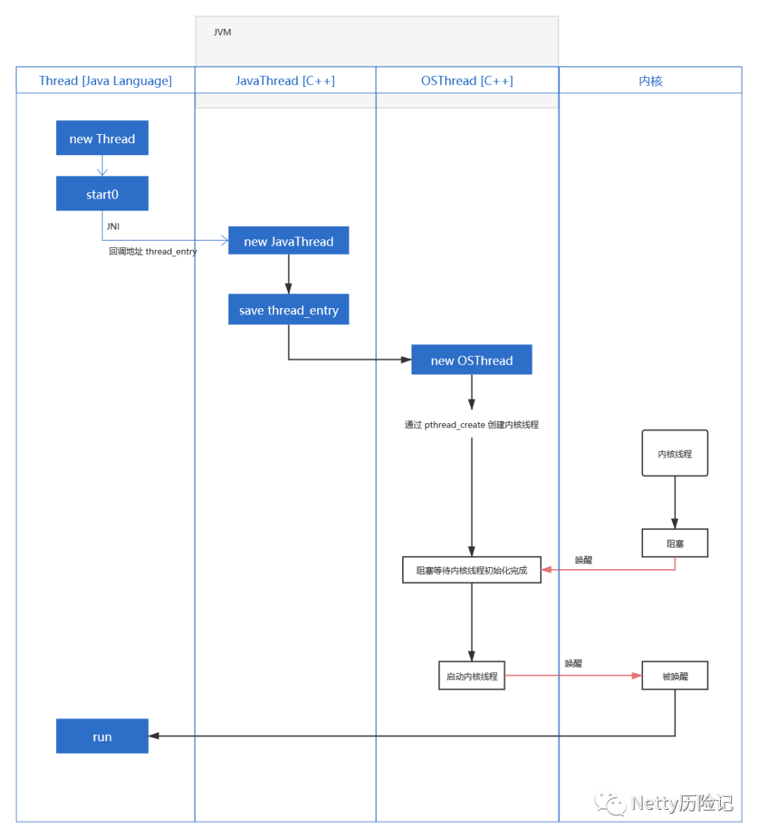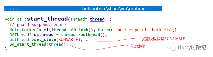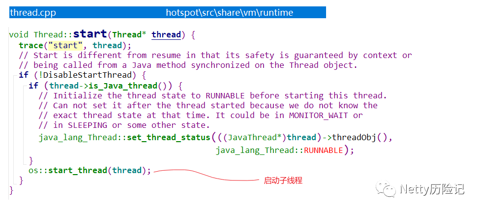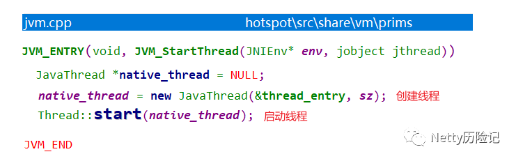 在Java中调用start方法启动线程, 底层映射到JVM中的JVM_StartThread方法.