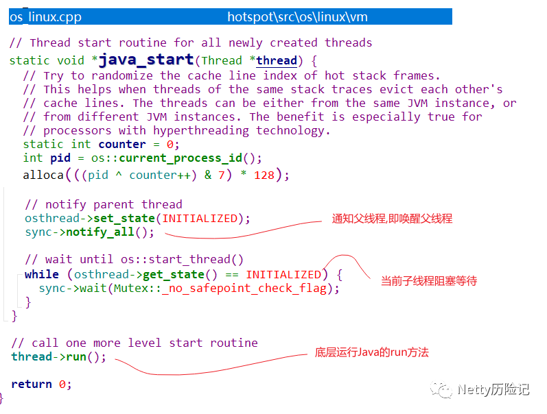 创建完成之后, 子线程执行java_start方法,而父线程暂时阻塞住.