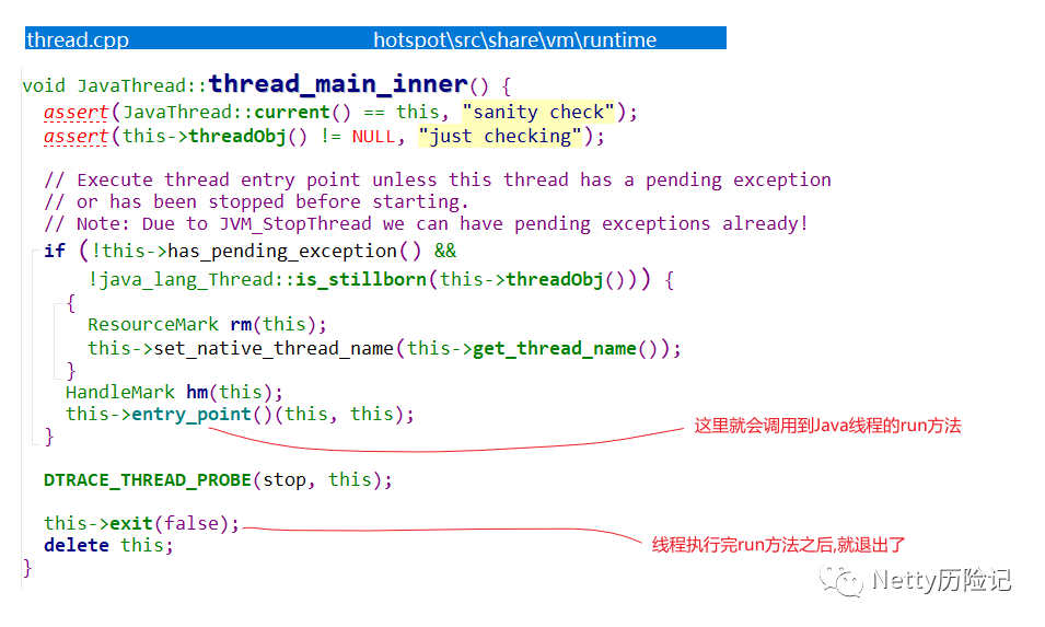 同时当Java线程的run方法执行完成之后, 线程就调用exit退出了. 这里也就解释了Java线程退出之后,内核线程也会退出的原因了.