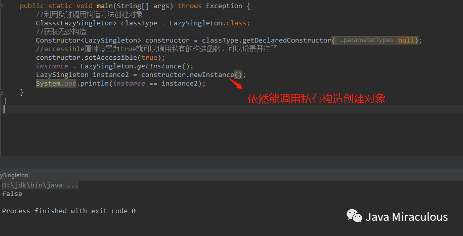 public static void main(String[] args) throws Exception {//利用反射调用构造方法创建对象Class<LazySingleton> classType = LazySingleton.class;//获取无参构造Constructor<LazySingleton> constructor = classType.getDeclaredConstructor(null);accessible属性设置为true就可以调用私有的构造函数,可以说是开挂了constructor.setAccessible(true);// instance = LazySingleton.getInstance();LazySingleton instance2 = constructor.newInstance();LazySingleton instance3 = constructor.newInstance();System.out.println(instance3 == instance2);}