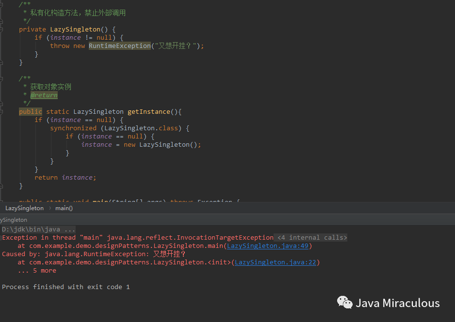 /*** 私有化构造方法,禁止外部调用*/private LazySingleton() {if (instance != null) {throw new RuntimeException("又想开挂?");}}
