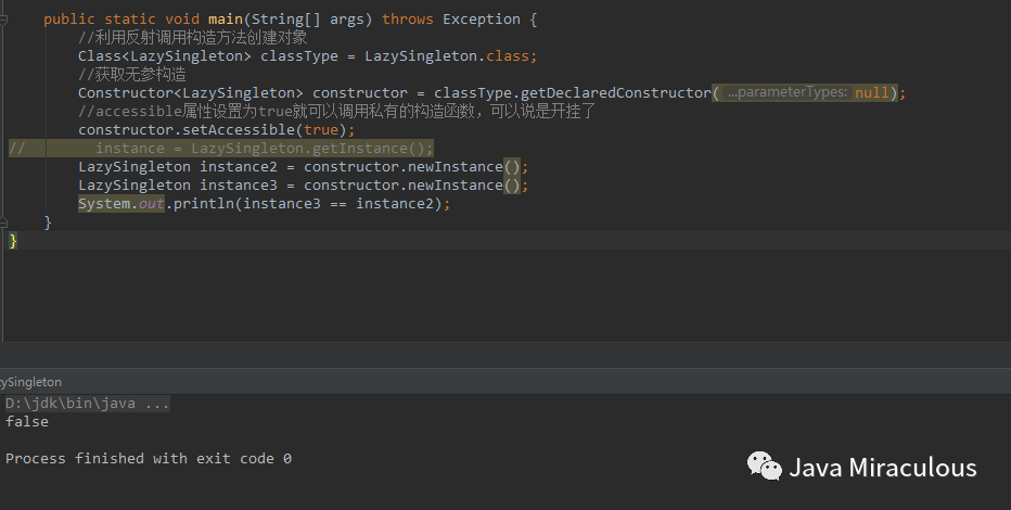 public static void main(String[] args) throws Exception {//利用反射调用构造方法创建对象Class<LazySingleton> classType = LazySingleton.class;//获取无参构造Constructor<LazySingleton> constructor = classType.getDeclaredConstructor(null);accessible属性设置为true就可以调用私有的构造函数,可以说是开挂了constructor.setAccessible(true);instance = LazySingleton.getInstance();LazySingleton instance2 = constructor.newInstance();System.out.println(instance == instance2);}