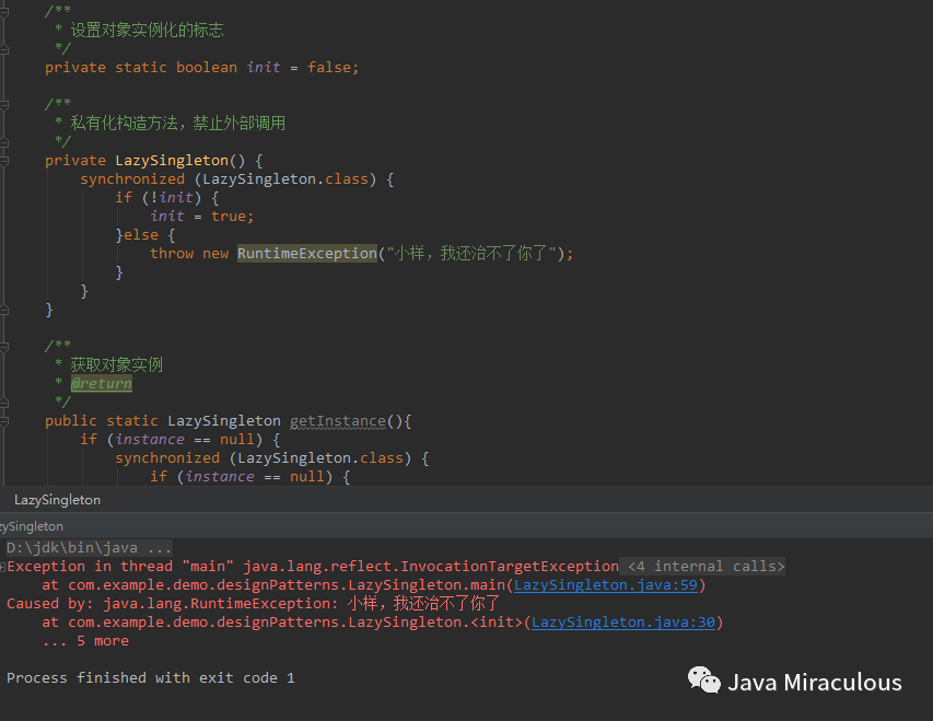 /*** 设置对象实例化的标志*/private static boolean init = false;/*** 私有化构造方法,禁止外部调用*/private LazySingleton() {synchronized (LazySingleton.class) {if (!init) {init = true;}else {throw new RuntimeException("小样,我还治不了你了");}}}