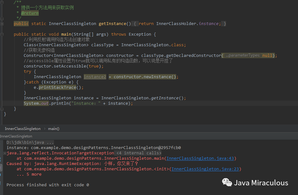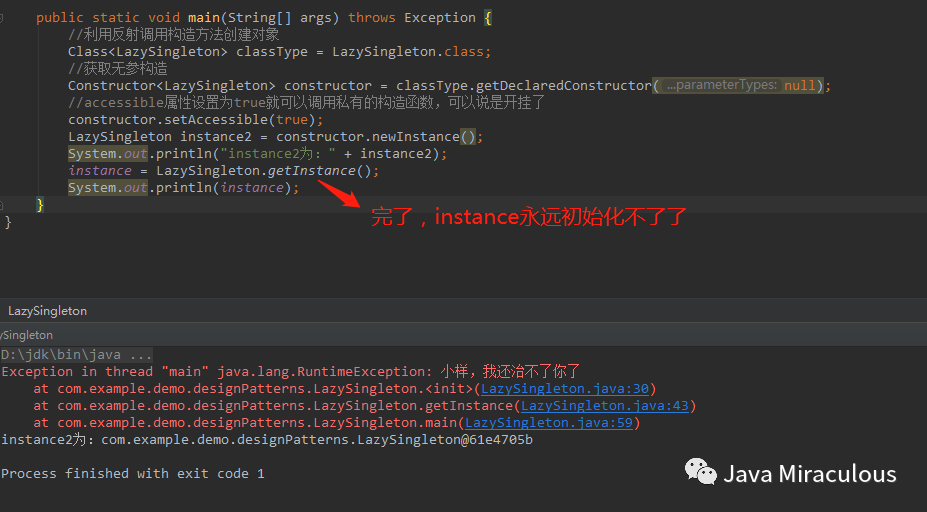 public static void main(String[] args) throws Exception {利用反射调用构造方法创建对象Class<LazySingleton> classType = LazySingleton.class;获取无参构造Constructor<LazySingleton> constructor = classType.getDeclaredConstructor(null);accessible属性设置为true就可以调用私有的构造函数,可以说是开挂了constructor.setAccessible(true);//在初始化instance前先反射调用一下LazySingleton instance2 = constructor.newInstance();System.out.println("instance2为:" + instance2);//你会发现instance永远初始化不了了instance = LazySingleton.getInstance();System.out.println(instance);}