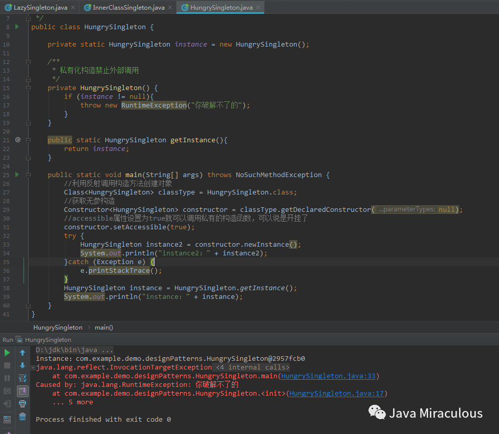 package com.example.demo.designPatterns;import java.lang.reflect.Constructor;/*** 饿汉式单例*/public class HungrySingleton {private static HungrySingleton instance = new HungrySingleton();/*** 私有化构造禁止外部调用*/private HungrySingleton() {if (instance != null){throw new RuntimeException("你破解不了的");}}public static HungrySingleton getInstance(){return instance;}public static void main(String[] args) throws NoSuchMethodException {//利用反射调用构造方法创建对象Class<HungrySingleton> classType = HungrySingleton.class;//获取无参构造Constructor<HungrySingleton> constructor = classType.getDeclaredConstructor(null);//accessible属性设置为true就可以调用私有的构造函数,可以说是开挂了constructor.setAccessible(true);try {HungrySingleton instance2 = constructor.newInstance();System.out.println("instance2:" + instance2);}catch (Exception e) {e.printStackTrace();}HungrySingleton instance = HungrySingleton.getInstance();System.out.println("instance:" + instance);}}