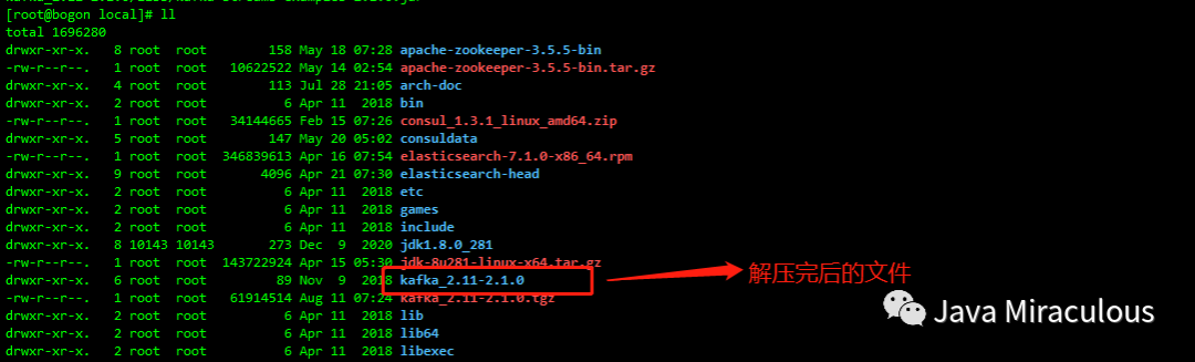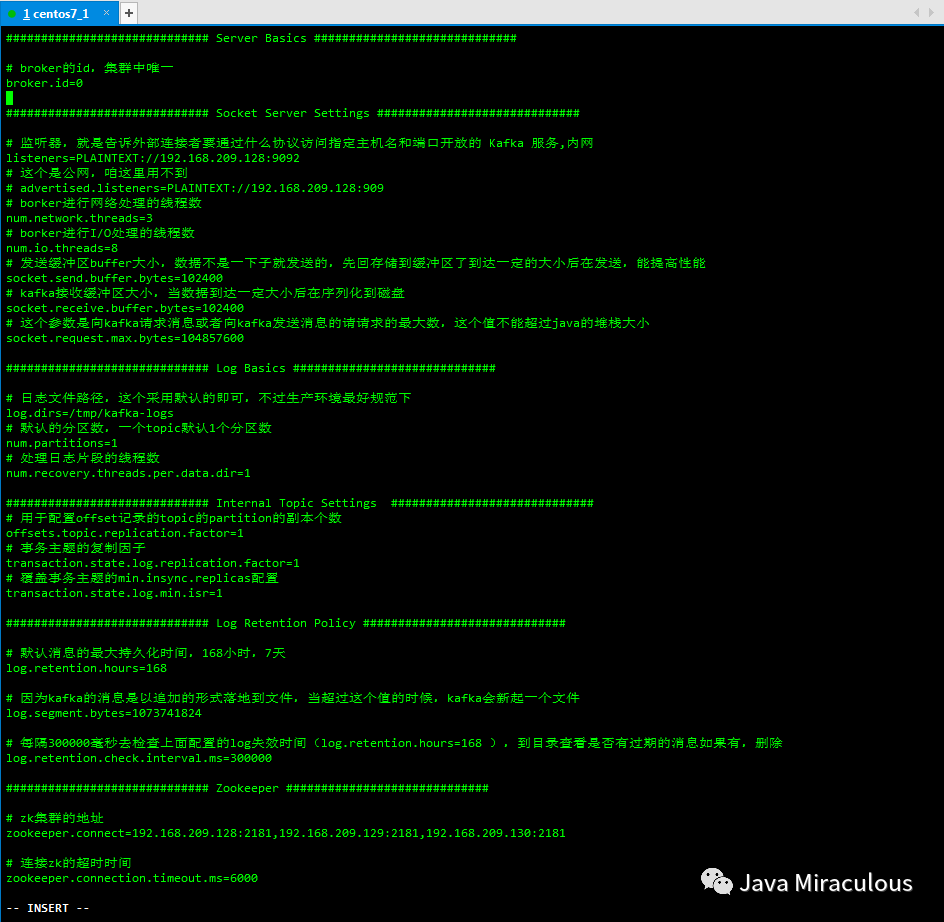 ############################# Server Basics ############################## broker的id,集群中唯一broker.id=0############################# Socket Server Settings ############################## 监听器,就是告诉外部连接者要通过什么协议访问指定主机名和端口开放的 Kafka 服务,内网listeners=PLAINTEXT://192.168.209.128:9092# 这个是公网,咱这里用不到# advertised.listeners=PLAINTEXT://192.168.209.128:909# borker进行网络处理的线程数num.network.threads=3# borker进行I/O处理的线程数num.io.threads=8# 发送缓冲区buffer大小,数据不是一下子就发送的,先回存储到缓冲区了到达一定的大小后在发送,能提高性能socket.send.buffer.bytes=102400# kafka接收缓冲区大小,当数据到达一定大小后在序列化到磁盘socket.receive.buffer.bytes=102400# 这个参数是向kafka请求消息或者向kafka发送消息的请请求的最大数,这个值不能超过java的堆栈大小socket.request.max.bytes=104857600############################# Log Basics ############################## 日志文件路径,这个采用默认的即可,不过生产环境最好规范下log.dirs=/tmp/kafka-logs# 默认的分区数,一个topic默认1个分区数num.partitions=1# 处理日志片段的线程数num.recovery.threads.per.data.dir=1############################# Internal Topic Settings ############################## 用于配置offset记录的topic的partition的副本个数offsets.topic.replication.factor=1# 事务主题的复制因子transaction.state.log.replication.factor=1# 覆盖事务主题的min.insync.replicas配置transaction.state.log.min.isr=1############################ Log Retention Policy ############################## 默认消息的最大持久化时间,168小时,7天log.retention.hours=168# 因为kafka的消息是以追加的形式落地到文件,当超过这个值的时候,kafka会新起一个文件log.segment.bytes=1073741824# 每隔300000毫秒去检查上面配置的log失效时间(log.retention.hours=168 ),到目录查看是否有过期的消息如果有,删除log.retention.check.interval.ms=300000############################# Zookeeper ############################## zk集群的地址zookeeper.connect=192.168.209.128:2181,192.168.209.129:2181,192.168.209.130:2181# 连接zk的超时时间zookeeper.connection.timeout.ms=6000############################# Group Coordinator Settings ############################## 这个参数的主要效果就是让coordinator推迟空消费组接收到成员加入请求后本应立即开启的rebalance。在实际使用时,假设你预估你的所有consumer组成员加入需要在10s内完成,那么你就可以设置该参数=10000group.initial.rebalance.delay.ms=0