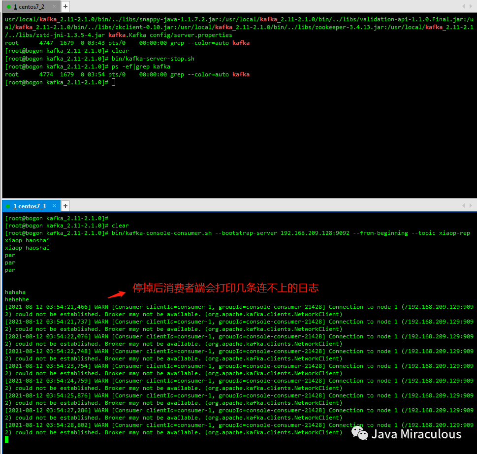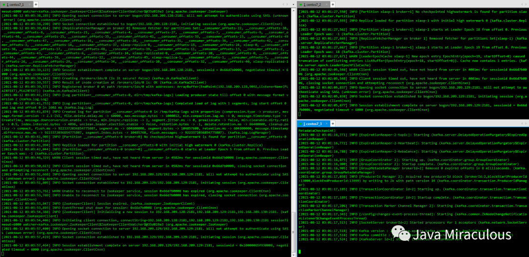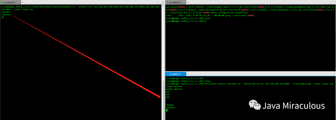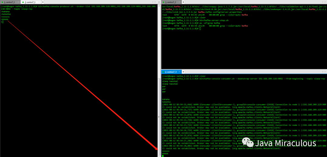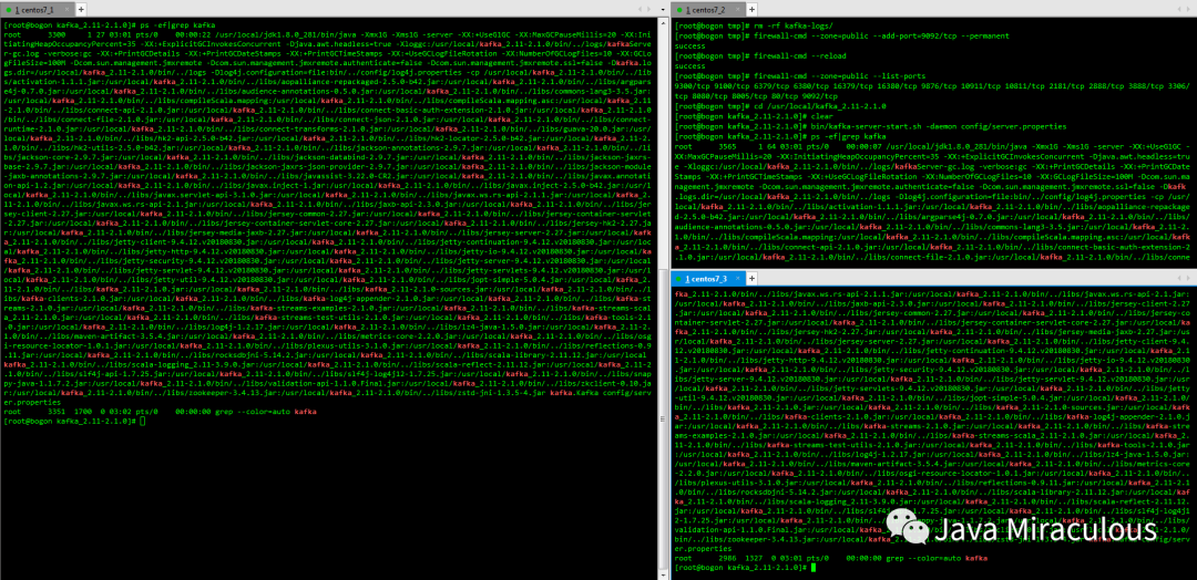 注:启动前删除server.properties中log.dirs对应目录中的kafka-logs,因为上面跑单机的时候产生的文件,不删除的话kafka集群起不来,另外防火墙要开放9092端口