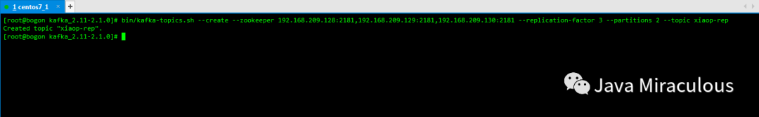 bin/kafka-topics.sh --create --zookeeper 192.168.209.128:2181,192.168.209.129:2181,192.168.209.130:2181 --replication-factor 3 --partitions 2 --topic xiaop-rep